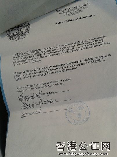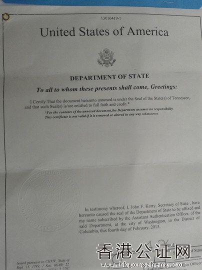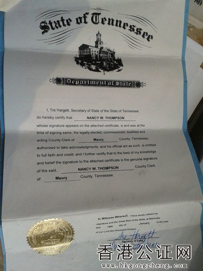 順序為:1、美國國務院文件,國務院蓋章、官員簽字;2、美國國務院印章;3、中國駐美大使館官員認證;4、美國田納西州州政府蓋章、副國務卿簽字;5、苗里郡政府蓋章、官員簽字。